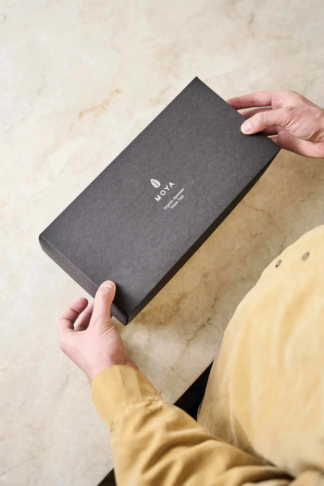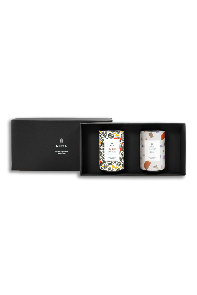 Ein sorgfältig ausgewähltes Duo japanischer Premiumtees in einer eleganten, umweltfreundlichen Verpackung aus festem, schwarzem Papier.